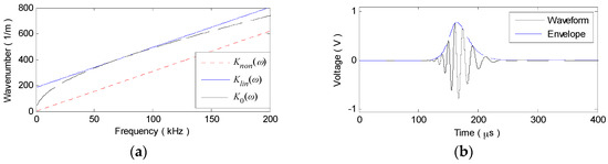 Both phase and group velocities of non-dispersion are a constant . From Equation (8), the non-dispersive time-domain sensor signal , indicating that is only a time-delayed version of and free of any dispersion effect.