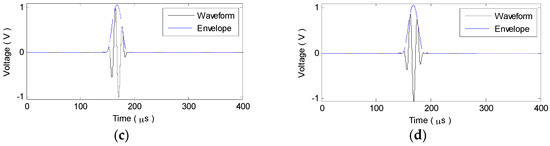 The similar simulation results of the S0 mode signal can be obtained, as shown in Figure 3. Under a much more nonlinear (seen in Figure 3a), the wavepacket in is largely extended to the tanglesome waveform with its amplitude severely decreased, as shown in Figure 3b. Whereas, the wavapacket shapes remain unchanged in both and , as illustrated in Figure 3c,d.