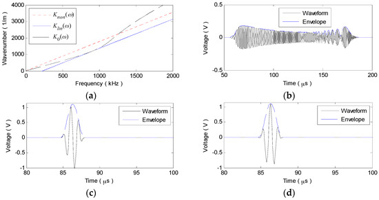 The simulation results of the A0 mode signal are shown in Figure 2. As Figure 2a illustrates, the theoretical wavenumber relations is a curve, showing the nonlinear-dispersion property. While the linearized ones and are the two parallel straight lines and a constant offset exists between them. In contrast to , passing through the original point exhibits the more ideal linear relation with . Due to the nonlinear , the wavepacket in is no longer a 3-cycle windowed toneburst and the time duration increases from 40 μs (seen in Figure 1a) to about 150 μs with its waveform disturbed and its amplitude decreased, as shown in Figure 2b. With linearized and , both the wavepackets in and are exempt from expansion and distortion, as Figure 2c,d illustrate. Note that, the wavepacket in remains a 3-cycle toneburst, but undergoes some waveform alteration in changing the relative sites and amplitudes of the three crests and troughs, as compared with that of or the excitation signal. This is caused by the initial-phase shift to the carrier wave of the wavepacket. Clearly, it is the only effect that the linear-dispersion brings about and can be generally ignored.