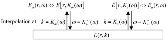 From Equation (10), and are the two distinct functions defined in the wavenumber or frequency domain, but share the same functional values. Thus, mathematically, performing the wavenumber-domain interpolation to at the equally-spaced frequency points will result in , the procedure of which can be mentioned as the construction of . Vice versa, during the so-called deconstruction of , can be obtained by interpolating with even wavenumber intervals in terms of , where is the inverse function of .