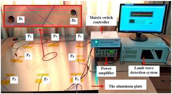 To verify the proposed signal construction and high spatial resolution imaging methods, an experiment is arranged on a 1000 mm × 1000 mm × 1.5 mm 2024 aluminum plate, which is largely used in aerospace structures. The material properties of the plate are given in Table 1. In the experimental validation, the adjacent dual damage imaging is carried out. As illustrated in Figure 6, the overall experiment setup is composed of Lamb wave detection system, matrix switch controller, power amplifier and the aluminum plate. Lamb wave detection system can generate Lamb wave signals, amplify and collect sensor signals. The matrix switch controller controls the working sequence of all PZT pairs and the power amplifier is applied to amplify the excitation signal to enlarge the monitoring area of the plate.