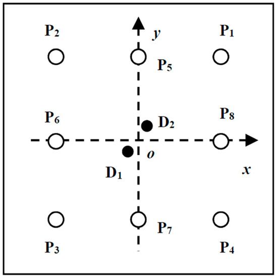 To monitor the entire plate, eight PZT wafers ~ (PZT-5, 8 mm in diameter and 0.5 mm in thickness) are deployed to form a square transducer array, as shown in Figure 6. The adjacent dual defects D1 and D2 are produced as the two closely-located through-holes with the diameter of 9 mm by an electrodrill. Figure 7 shows the distribution of the PZT array and dual damages in the monitored region. Their exact positions in the orthogonal coordinate (seen in Figure 7) are listed in Table 2.