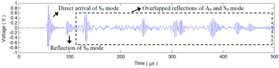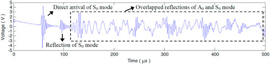 A step pulse excitation signal with the raising time of 0.25 μs is produced by the Lamb wave detection system to acquire the impulse response of each PZT pair. By convoluting the impulse response with a 3-cycle sine burst centered at 90 kHz, the desired sensor signals dominated by A0 mode can be conveniently extracted. After the derivation calculus of the measured step pulse response (seen in Figure 8) measured by without any defects, the impulse response is obtained, as Figure 9 shows. It can be seen that, and are extremely complicated by multi-mode and dispersion characteristics. What can be recognized from the two broadband responses is merely the S0 mode direct arrival and boundary reflection. The following A0 or S0 mode wavepackets are severely overlapped with each other, as Figure 8 and Figure 9 illustrate. The sensor signal extracted from is shown in Figure 10a. The A0 mode direct arrival in distinctly spreads out. Except for the first reflected wavepacket of A0 mode near 250 μs in , the other reflections after 310 μs are badly expanded and superposed. The signal resolution is grievously decreased. Note that, with less dispersion, the direct arrival of S0 mode is in a compact wavepacket (seen in the interval 50–100 μs in Figure 10a).