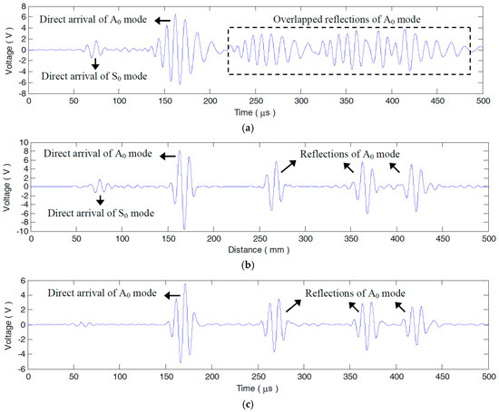 As Figure 10b shows, either the A0 mode direct arrival or the reflections in get well recompressed to the temporal sites relevant to their travelling times. Because of wavepacket recovery, their amplitudes are pronouncedly heightened without signal waveform deformation, as compared with (seen in Figure 10a). Conversely, the residual S0 mode wavepacket in (seen in the interval 50–100 μs in Figure 10b) is uncompensated but suffers more distortion and amplitude-attenuation. The reason for this is that LDSC is only performed with the A0 mode dispersion characteristic.