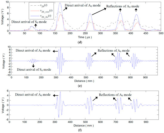 Original extracted and processed A0 mode dominated sensor signals measured by . (a) Original extracted sensor signal from (b) LDSC-processed result of ; (c) NDSC-processed result of ; (d) Envelopes of , and ; (e) TDDM-processed result of ; (f) TDDT-processed result of .