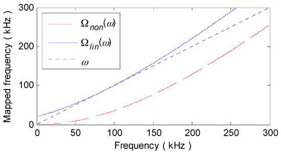 Unlike , is established by linearizing at and is actually the local linear approximation of around the central frequency . Even at . From Equation (14), the mapped frequency point during the interpolation will deviate much less from the former one , especially within the frequency range of . Because of this, the influence of LDSC on is so slight that can be nearly neglected. While in NDSC, with the non-zero offset between and , differs much more from and is greatly varied.