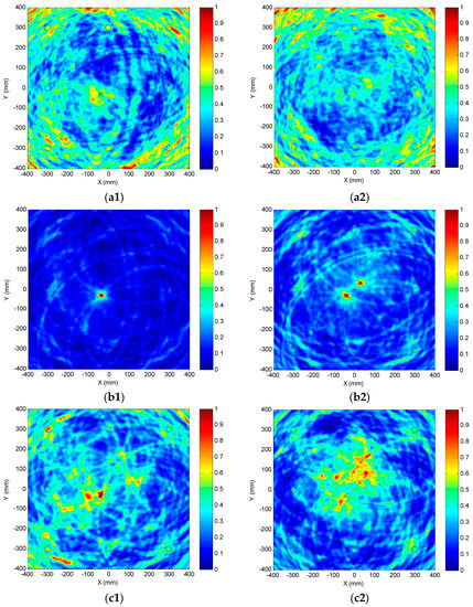 Using the original, LDSC or NDSC-processed scattered signals acquired by all 28 PZT pairs of the sparse array, several images for the single or dual adjacent damages can be generated with Equations (27)–(29), as shown in Figure 16 where each symbol “X” denotes the actual damage position and the circulars denote the PZT wafers. With the dispersion effect on the scattered signals (seen in Figure 15a1,a2), no flaw spot can be clearly observed at each actual damage position in Figure 16a1,a2. The imaging for the single or dual damages obviously fails.