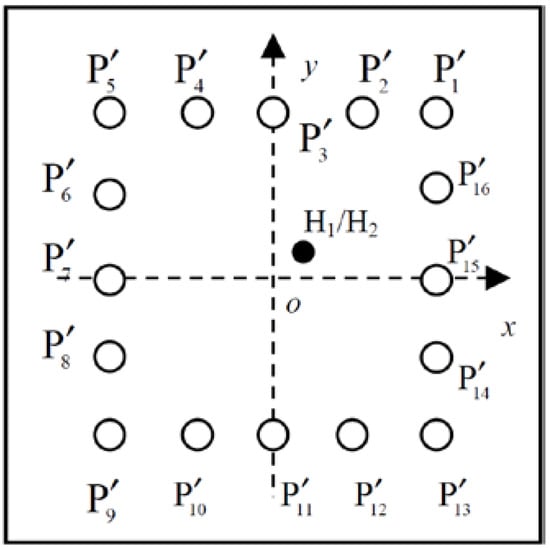 With relatively more PZT wafers, the above high spatial resolution imaging methods can be attempted for quantitative imaging, in which besides locations, the other particular damage properties, e.g., severities or geometric dimensions, can be attained. In the numerical simulation, because of the excellent dispersion compensation capacity, LDSC is adopted for quantitatively imaging a rectangular hole H1 (50 mm × 60 mm) or circular hole H2 (40 mm in diameter) in a 1000 mm × 1000 mm × 1.5 mm aluminum plate with an array of 16 PZT wafers ~, as shown in Figure 17. Table 3 gives the exact positions of the PZT wafers and holes. The simulation is conducted by the commercial finite element modeling (FEM) software ABAQUS®/EXPLICITE. The plate is modeled using the A4 node shell elements (S4) with the material parameters in Table 1. The step pulse excitation signal with the raising time of 0.25 μs is loaded as the opposing out-of-plane point-source and the deviation of the out-of-plane strain at each sensing point is calculated as the impulse response with the fixed time step of 0.5 μs. To extract the A0 mode dominated sensor signal from the impulse response of every PZT pair, the same 3-cycle sine burst excitation signal centered at 90 kHz is used.