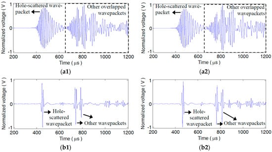Subtracting the A0 mode sensor signals of the health plate from those of the damaged plate, the damage scattered signals can be obtained. Figure 15a1,a2 show the typical original dispersive scattered signals and from the single and dual adjacent damages measured by , respectively. Due to dispersion, both the damage scattered wavepackets and the other wavepackets are elongated and seriously overlapped with each other in and . It goes into an extraordinary challenge to interpret or .