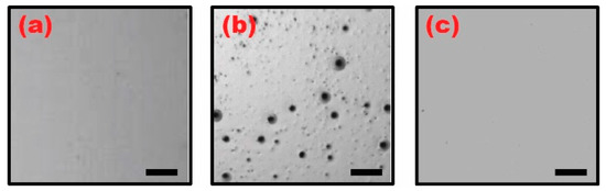 To understand how such poor EWOD performance occurred, we inspected the surface quality of the three different samples dip-coated with (a) a pure ion gel layer cured at 70 °C; (b) an ion gel layer baked at 70 °C over which an additional Teflon layer was cured at 110 °C; and (c) a pure Teflon layer baked at 110 °C. Figure 4 shows the microscopic images of these three samples. The ion gel layer was first dip-coated using a gel solution prepared with a high concentration of IL at a 4:1 weight ratio with the CP and cured at 70 °C. A uniform surface quality is observed for the pure ion gel layer (Figure 4a). However, when a Teflon layer was subsequently dip-coated over the gel layer and cured at 110 °C, abundant surface defects were clearly observed (Figure 4b). This was then compared to the case of a pure Teflon layer dip-coated and baked at 110 °C, where no surface defects were observed (Figure 4c). Based on our observations shown in Figure 4, it becomes evident that the surface defects manifested on the dip-coated gel layer only after the Teflon was dip-coated over it and cured at 110 °C, resulting in poor EWOD performance. Such a surface degradation phenomenon of the ion gel layer can be further reinforced by several previous studies. Jansen et al. experimentally showed that the melting point of the ion gel layer is significantly lowered when increasing the concentration of the [EMIM][TFSI] ionic liquid in the gel solution [35]. They observed that the neat [P(VDF-HFP)] copolymer has a melting point around 140 °C, which consequently drops down to 90 °C when the gel layer is made at a high weight ratio of 4:1 between the IL and the CP. This is because large contents of the CP (or a small amount of the IL) in the gel layer increases the crystallinity of the gelated layer and such large crystalline regions require more heat to melt than the amorphous regions [35]. In contrast, the solutions made with highly concentrated IL create less crystalline regions in the gel layer, resulting in an observed melting point depression. It was also reported that, when thin-film polymer layers are treated at a temperature higher than their melting points, the surface tension variations caused by phase separation induce surface deformation and roughness within the thin films [36]. In our experiments using high concentration of the IL at a 4:1 weight ratio with the CP, the ion gel layer underneath the Teflon layer experienced melting and migration during the Teflon curing period at 110 °C, which is above the 90 °C melting point of the gel layer [35,36]. This led to the formation of tiny aggregations, causing the surface defects as shown in Figure 4b. Hence, it was critical to understand how IL concentrations influence on EWOD performance of the dip-coated gel layers. Such is discussed in the next section.