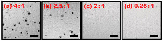 For this study, several ion gel solutions were prepared by varying the weight ratios from 4:1 to 0.25:1 between the IL and the CP. These mixtures were further diluted in the same amount of acetone at 9%. Dip-coating and curing processes were implemented for both ion gel and Teflon layers, respectively. We inspected the surface quality of the samples dip-coated with the gel solutions prepared at various weight ratios and their microscopic images are shown in Figure 5. As discussed above, the surface defects were evident for the gel layer dip-coated with the solution containing a high concentration of the IL at a 4:1 weight ratio with the CP (Figure 5a). Such surface defects decrease, as the IL content is lowered relative to the CP (e.g., the layer fabricated at a 2.5:1 weight ratio shown in Figure 5b). For the solutions with low IL concentrations at 2:1 (Figure 5c) and 0.25:1 (Figure 5d), the surface defects are no longer observed. This is due to the effective increase of the gel layer’s melting point over the Teflon baking temperature at 110 °C as IL concentrations are lowered beyond the 2:1 ratio [35]. This results in the improvement of surface quality, as surface defects no longer arise from gel layer phase change. These samples shown in Figure 5 were subsequently tested for static EWOD experiments to examine the effect of the IL concentrations on EWOD performance. The graphs in Figure 6 present the droplet contact angles measured on the samples fabricated with four different weight ratios between the IL and the CP. As expected from the results in Figure 5, the ion gel samples fabricated at high IL weight ratios of 4:1 and 2.5:1 with the CP provided poor EWOD performance where bubbles were caused by electrolysis as a sign of dielectric failure (see Figure 6a,b). For the other cases with the low IL contents (e.g., 2:1 and 0.25:1 weight ratios), full contact angle modulation was achieved without electrolysis until reaching the contact angle saturation around 58° (see Figure 6c). From the experimental results in Figure 6, it is understood that the gel solution where the IL content is at least lower than the 2:1 weight ratio with the CP is required to obtain stable and robust dip-coated ion gel layers that enable full contact angle modulation without electrolysis. For all following experiments, samples were prepared using solutions with a low IL:CP ratio of 0.25:1.