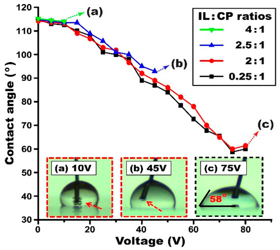 Effect of the IL concentrations in the gel solution on EWOD performance. The initial contact angle was similarly measured to be 115° on the Teflon surface for all the cases. EWOD performance was studied by measuring the contact angles with varying input voltages. Full contact angle modulation without electrolysis was achieved for the ion gel solutions prepared with low IL contents at 2:1 and 0.25:1 weight ratios with the CP. The other two cases at 4:1 and 2.5:1 showed poor EWOD performance. The insets (a,b) show the onset of bubbles generated by electrolysis (indicated by red arrows); while the inset (c) shows full contact angle modulation up to 58° achieved without electrolysis. All samples were prepared in the same experimental conditions, such as constant solution concentration, withdrawal speed, and a Teflon layer of 670 nm thickness.