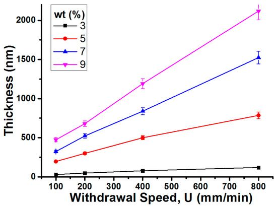 According to the Landau-Levich derivation [29], the thickness of dip-coated layers is mainly determined by solution viscosity and withdrawal speed. To control the gel layer thickness by dip-coating, the gel solution was prepared at the fixed 0.25:1 weight ratio between the IL and CP, while overall solution concentrations (i.e., both IL and CP) with respect to an acetone solvent and withdrawal speeds were varied. Figure 7 presents the measured thicknesses of the dip-coated layers. Gel solutions with higher concentrations of the IL and the CP (e.g., 9%) in an acetone solvent are more viscous, consequently forming thicker layers. Likewise, dip coating at faster withdrawal speeds gives the wet film layer less time to develop, thus depositing thicker layers. It is worth noting that, for the given mixture ratio at 0.25:1, the solution viscosity was significantly high even at 9% and close to solute saturation. For the solutions at concentrations higher than 9%, the dip-coated samples showed immediate gelation and highly uneven surfaces and hence poor EWOD performance with electrolysis. This indicates that there is a limit to the thickness of functional ion gel layers to be produced by the dip-coating method. By adjusting the acetone concentrations and withdrawal speeds, we were able to vary the thicknesses of the dip-coated gel layer from 40 nm to 2.21 µm, which are a few orders thinner than the ones fabricated by the previous spin-coating method [4,14,15,34].