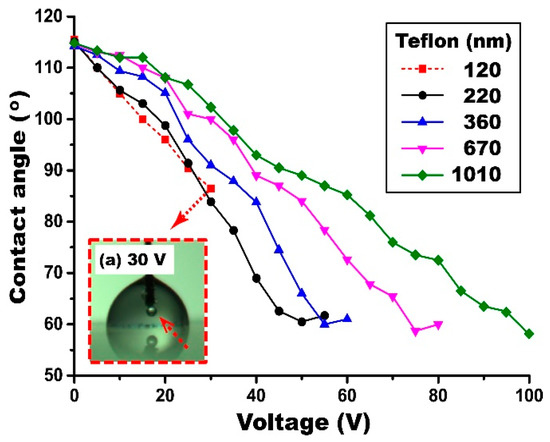 Since ion gel layers are fabricated by a new dip-coating method, it is also important to understand the thickness effect of the dip-coated Teflon layer on EWOD performance. With the gel layer fixed at 1.19 µm, the thickness of the Teflon layer was varied from 120 to 1010 nm. The contact angles were measured at varying voltage inputs and the results are shown in Figure 9. EWOD performance improved as decreasing the thickness of the Teflon layer. For example, full contact angle modulation was achieved around 60° at 50 V for the 220 nm thick Teflon layer, while the contact angle was around 92° for the 1010 nm thick layer at the same voltage input. These observations are very consistent with our general understanding of EWOD performance, i.e., the capacitance is inversely proportional to the layer thickness and thus a thin Teflon layer can achieve more contact angle modulation than that of a thick layer at the same bias voltage. However, for very thin Teflon layers such as the case of 120 nm, electrolysis takes place at 30 V before full contact angle modulation (see Figure 9a). Since the capacitance of the ion gel is a few orders higher than that of the Teflon, nearly 99% of the voltage input is distributed across the hydrophobic layer when the two capacitors of the ion gel and Teflon layers are connected in series, as shown in Figure 3. The theoretical breakdown voltage for the 120 nm thick Teflon layer was estimated as 24 V [9]. Nevertheless, the droplet contact angle was further modulated even at the voltage of 30 V exceeding this breakdown threshold. This observation can be explained by several previous studies [37,38], reporting that, although the voltage distributed across the Teflon layer exceeds its breakdown voltage, the device performs continuously while also slowly degrading.