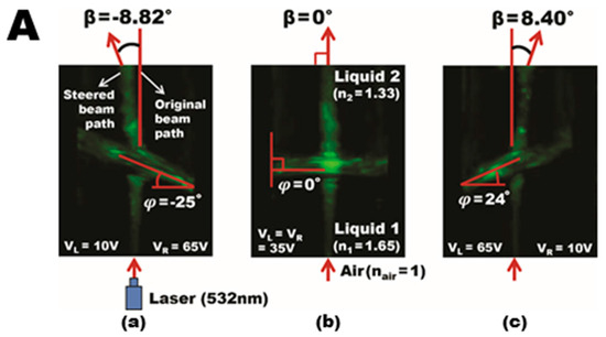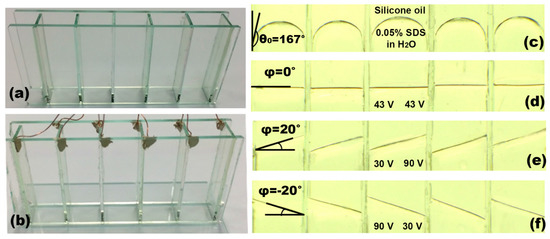 To demonstrate the viability of our dip-coated ion gel for 3D EWOD devices, a 5 × 1 liquid prism array were fabricated with an aperture area of 50 × 7 mm2 as an example of 3D devices. Multiple sidewalls were first assembled to form five adjacent hollow structures (Figure 10a). Copper wires were connected on each sidewall using a conductive adhesive. The gel solution was prepared at a 0.25:1 weight ratio between the [EMIM][TFSI] ionic liquid and the [P(VDF-HFP)] copolymer, which was further diluted in acetone at 3%. A single-step dip-coating procedure was conducted to deposit the ion gel dielectric layer over the arrayed 3D hollow structures, which offers the benefits of simplicity, scalability, and high throughput over the spin-coating method as discussed in Section 2. After curing the gel layer coated on the 3D device surfaces at 70 °C, another dip-coating and baking processes at 110 °C were carried out to provide a hydrophobic (Teflon) layer. Figure 10b presents the fully assembled 3D structure of the arrayed prisms where an additional ITO base plate serves as the common ground electrode. Two immiscible liquids, water and silicone oil, were then filled in each of the prisms. To improve interfacial stability, a 0.05 wt % sodium dodecyl sulfate (SDS) surfactant was added to water [39]. Due to Laplace pressure difference, its initial contact angle is measured at 167°, as illustrated in Figure 10c. For operation of the liquid prism array fabricated, we built a LabView-programmed multi-channel power supply (Keysight N6700B) which can separately control the bias voltages applied to all ten inner sidewalls to achieve individual control of the five prisms. Figure 10d–f show the versatility of our prism arrays that are formed with the apex angles, ranging −20° ≤ ϕ ≤ 20° by varying the applied voltages at each of the prism sidewalls. By using two liquids with different refractive indices (nair ≠ n1 ≠ n2), the previous studies have demonstrated beam steering of the incoming light that can be effectively achieved without the need of bulky mechanical moving parts [22,23,24]. Figure 11a shows an experimental demonstration of beam steering using a single liquid prism filled with high-reflective-index oil 1-bromonapthalene (liquid 1) and water (liquid 2). Beam steering angles of β = −8.82°, 0°, 8.40° were achieved when voltages were applied due to respective prism apex angle modulations as a result of the large difference in refractive indices between the two liquids [22]. Our group recently achieved the highest beam steering angle ever demonstrated up to β = 19.06° using a double-stacked prism configuration [22]. Supplementary to the double-stacked prism configuration, we have experimentally demonstrated spatial focal tuning using 3 × 1 linearly arrayed liquid prisms, as illustrated in Figure 11b. Each prism in the array can be individually controlled to replicate the subsections of a conventional Fresnel lens. Incoming light can then be steered accordingly to vary the focal length of the lens along both the longitudinal and lateral directions, thus making x- and z-axis spatial tuning possible [23].