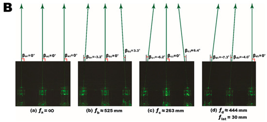 Experimental demonstrations of beam steering with the dip-coatable 3D liquid prisms. (A) The top images show the beam deflection using a single prism; (a) At ϕ = −25°, the beam steering was achieved as large as β = −8.82°; (b) At ϕ = 0°, a laser beam passes perpendicularly through the interface; (c) Similarly, we can achieve beam steering of β = 8.40° at φ = 24° (reprinted from the Reference [20] with the permission). (B) The bottom images present arrayed liquid prims that enable 3D focal tuning by controlling arrayed prisms; (a) When all steering angles are zero, βa1 = βa2 = βa3 = 0°, the Fresnel lens does not perform as a concentrating element (i.e., fa = ∞); (b) When the outer prisms are modulated such that the steering is βb1 = −3.2°, βb3 = 3.3° and βb2 remains at 0°, the beams converge and the lens is then said to have a focal length at ƒb ≈ 525 mm; (c) Further manipulation at higher angles of βc1 = −6.2°, βc2 = 0°, and βc3 = 6.4° allows the focal point to reduce from ƒb ≈ 525 mm to ƒc ≈ 263 mm; (d) By controlling the arrayed prisms (βd1 = −7.3°, βd2 = −4.0°, and βd3 = 0°) non-symmetrically, spatial focal tuning has been achieved in both longitudinal and lateral directions at ƒd ≈ 444 mm and ƒlat = 30 mm (reprinted from [21] with the permission).