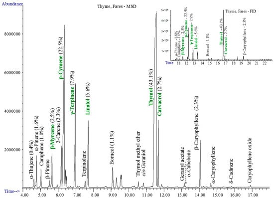 The GC-MSD and GC-FID (insert) chromatograms of thyme oil.