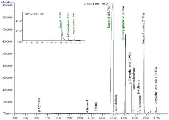 The GC-MSD and GC-FID (insert) chromatograms of clove oil.
