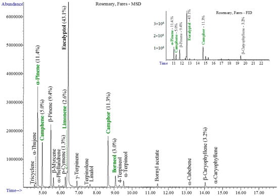 The GC-MSD and GC-FID (insert) chromatograms of rosemary oil.