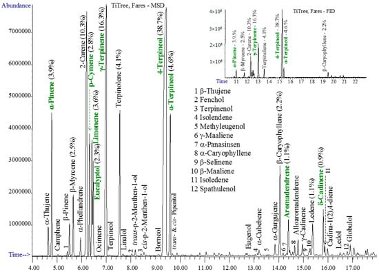 The GC-MSD and GC-FID (insert) chromatograms of tea tree oil.