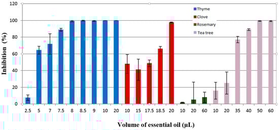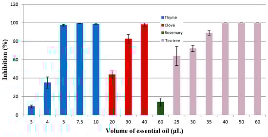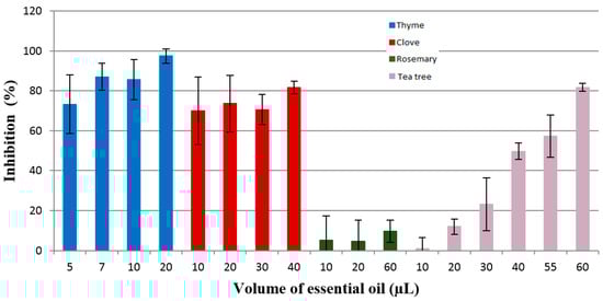 Rosemary essential oil exhibits antifungal activity, but this was very low. For a volume of 60 µL of this oil, the inhibition was below 10%. Tea tree essential oil had an inhibition rate higher than 80% against F. graminearum G87 only for the highest volume used in this study (60 µL).