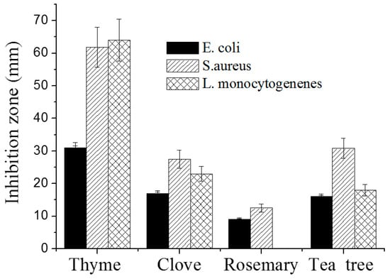 The antibacterial effect of EOs against the growth of S. aureus, E. coli, and L. monocytogenes was established by the agar disc diffusion method, and the results are presented in Figure 8. On Mueller–Hinten (MH) agar plates, the inhibition zones of S. aureus are 64.7 ± 1.2 mm for thyme oil, 27.8 ± 3.4 mm for tea tree oil, 27.8 ± 4.0 mm for clove oil, and 12.8 ± 4.3 mm for rosemary oil. For E. coli, the inhibition zones are 35.5 ± 4.6 mm for thyme oil, 27.0 ± 3.4 mm for tea tree oil, 19.5 ± 0.5 mm for clove oil, and 15.1 ± 0.5 mm for rosemary oil. The diameters of the inhibition zones in the case of L. monocytogenes growth are of 69.5 ± 6.4 mm for thyme oil, 22.0 ± 2.8 mm for tea tree oil, and 28.5 ± 2.1 mm for clove oil. There is no inhibition zone for rosemary.