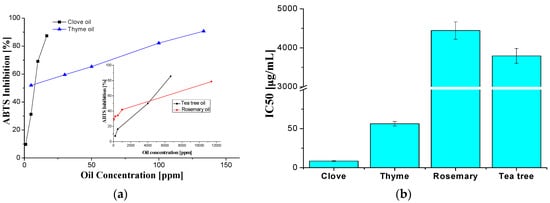ABTS radical discoloration of studied essential oils (a) and the values of sample concentration required to scavenge 50% of the ABTS free radicals (IC50); (b) of selected essential oils.