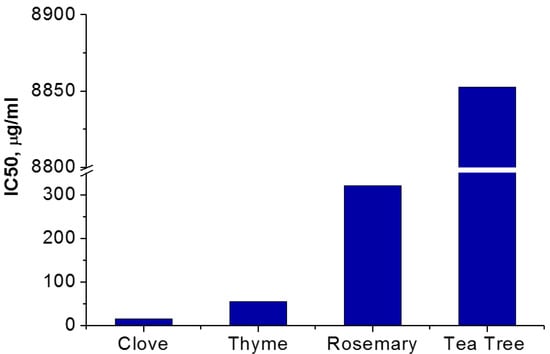 For the analyzed essential oils, IC50 is in the μg/mL range assigned to a very good antioxidant activity [55]. From the selected essential oils, the clove oil is by far the most radical scavenging active, with an IC50 of 8 μg/mL. The antioxidant activity was associated with the presence of phenolic compounds in the composition of essential oils, as determined by the Folin–Ciocâlteu method and the GC-FID technique and ORAC values. The antioxidant activity varies in the following order: clove oil > thyme oil > rosemary oil >> tea tree oil. Based on the radical scavenging tests, the clove oil is the most effective antioxidant is recommended for further such applications.
