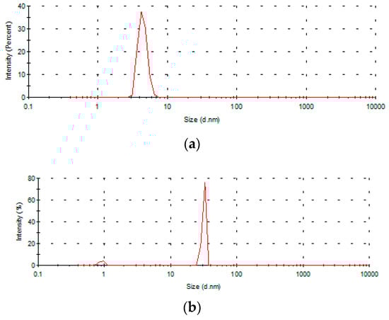 The stability of the chitosan/essential oil emulsions was sustained by dynamic light scattering (DLS) analysis, which showed a main particle population with low dimensions (Figure 11), with the distribution showing, in the low dimension range, a single peak and a polydispersity index (PDI)-approached value of 1.0 (Table 7). The chitosan/essential oil emulsions contain two kinds of particle populations: the first one is very small, where d = 5 nm for the chitosan solution and 11–70 (350) nm for the emulsion containing EOs, and the second contains larger particles of 850 nm for CS and 2500–8800 nm for CS/EOs emulsions. Oils are probably concentrated around CS particles because of aggregation.