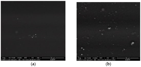 Scanning electron microscopy examination reveals the morphology of the films obtained by the incorporation of essential oils into chitosan films—Figure 12. The films are relatively homogeneous, and dispersion of the essential oil in the film obtained by solvent casting is homogeneous, as is evident from the SEM images taken at high magnification (2000×).