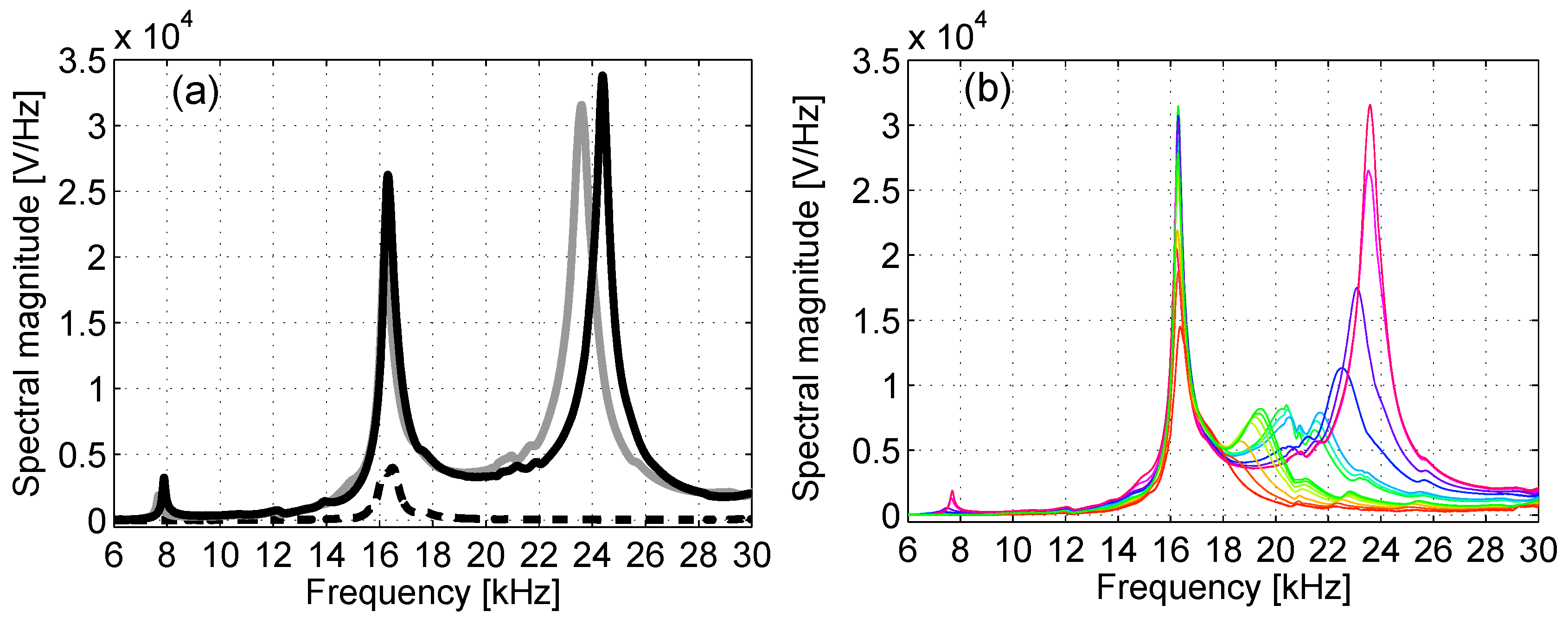 - Bentahar, M.; El Guerjouma, R.; Idijmarene, S.; Scalerandi, M. Influence of noise on the threshold for detection of elastic nonlinearity. J. Appl. Phys. 2013, 113, 043516. [Google Scholar] [CrossRef]