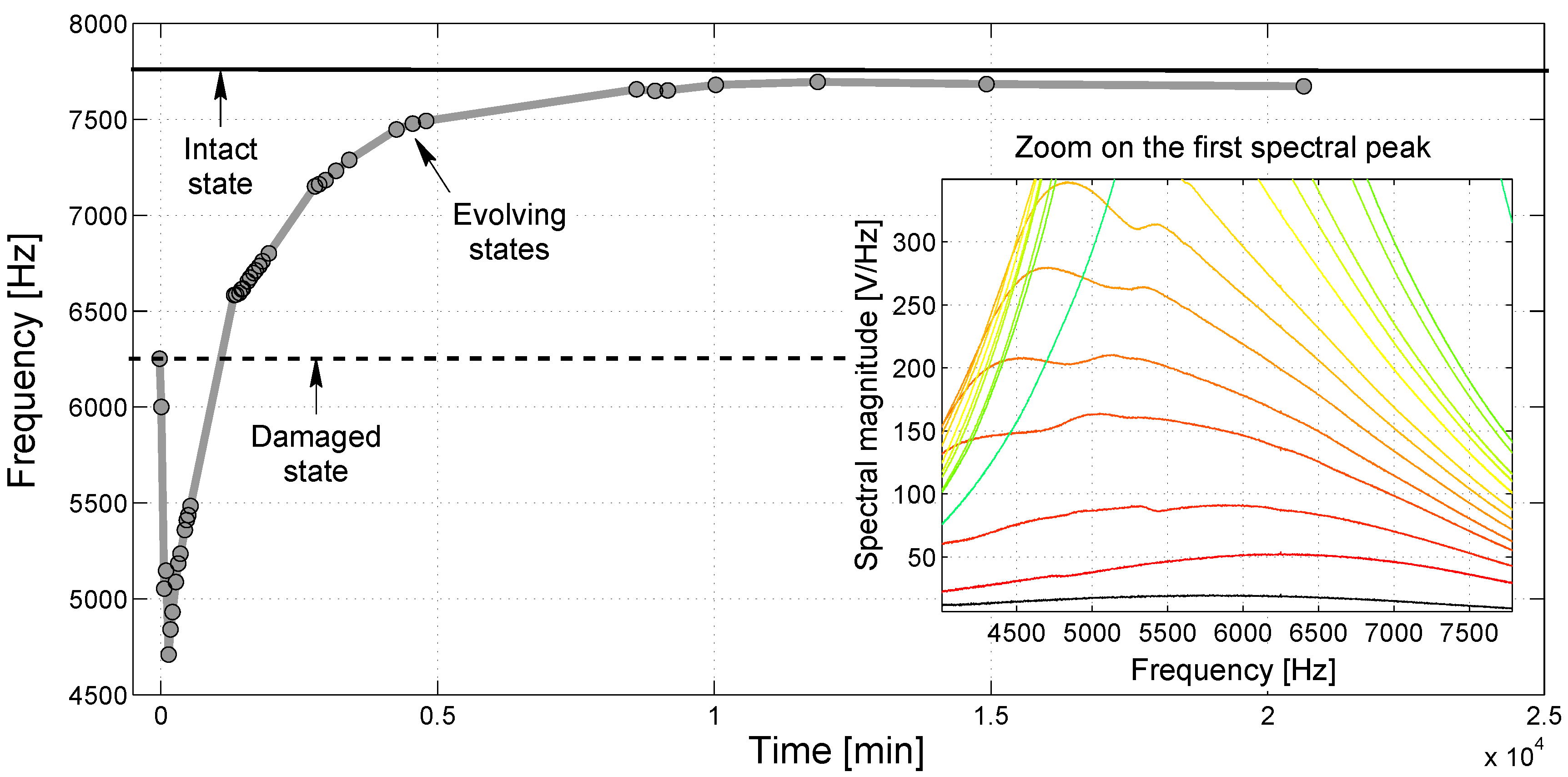 - at regular time intervals denoted as “2” to “n”, during the healing process. The first set of measures during healing was taken a few minutes after the healing process has started, and the monitoring procedure continued up to three weeks; though major changes in the acoustic behavior turned out to be established in the first few days, as will be detailed in the following.