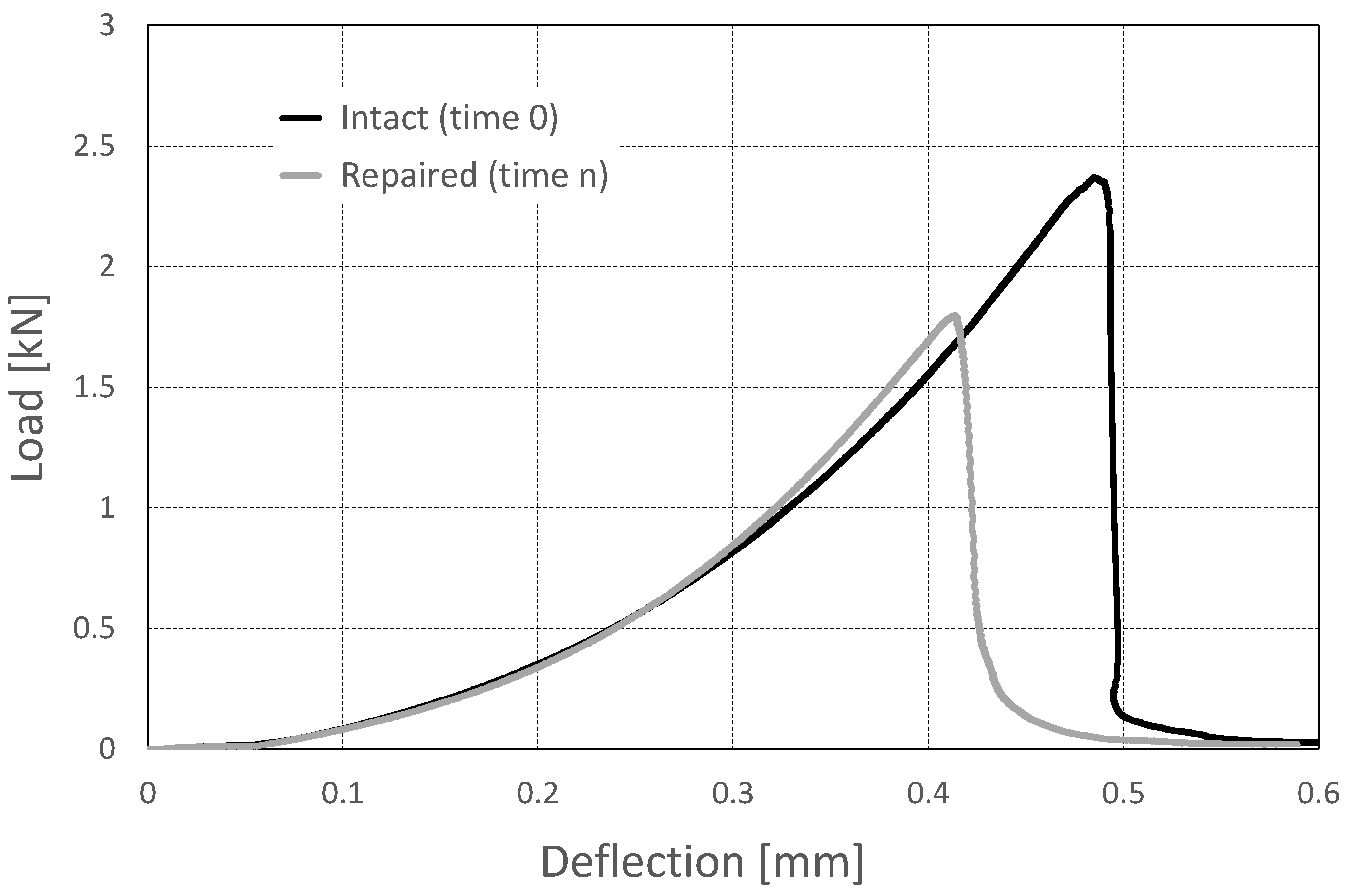 - in the damaged state, referred to as “1” (i.e., immediately after the generation of the mechanical disconnection at mid-span and before the application of the healing agent on the fracture surface);