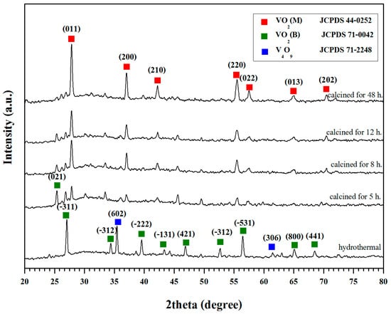 Figure 1 shows XRD patterns of the products obtained from the hydrothermal and calcination processes. The characteristic XRD peaks at 2 theta of 27.11°, 34.49°, 39.59°, and 56.33°, representing the VO2(B) phase, can be observed after the hydrothermal treatment. These correspond to the (−311), (−312), (−222), and (−531) planes of the metal oxide crystal. Besides, additional peaks at 35.58° and 61.13° also exist. These are attributed to the (602) and (306) plane of V4O9, which could be an intermediate product of the process (see Equations (1)–(3)). However, by further treating these materials through the calcination process, the above XRD peaks disappeared whereas those of which representing the characteristic pattern of monoclinic vanadium dioxide (VO2(M)) immerged. The latter include the peaks at 2θ of 27.86°, 37.05°, 42.23°, 55.53°, 57.53°, 65.00° and 70.44°, corresponding to the crystal planes of (011), (200), (210), (220), (022), (013) and (202) of VO2(M), respectively [17,21]. Furthermore, by analyzing the XRD peak of (011) plane with the Scherrer’s equation, crystal size of the VO2(M) can be calculated. The value obtained was 26.9 nm which is close to that was reported by Ji et al. (17.8 nm) [22] and Chen et al. (25 nm) [18].