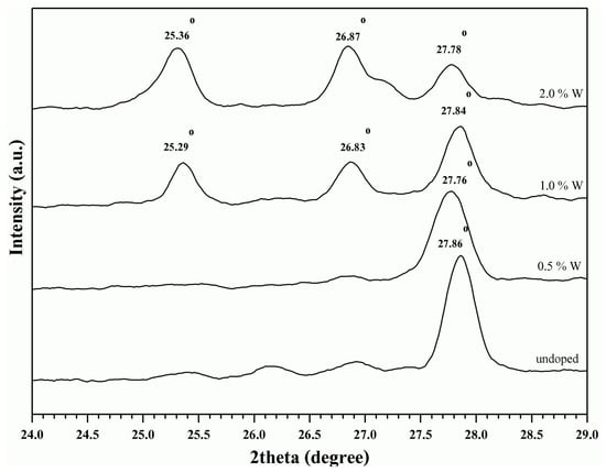 The enlarged XRD patterns (24°–29°) of VO2(M) and the doped metal oxides (V1−xWxO2) obtained by applying various concentration of the dopant (W).