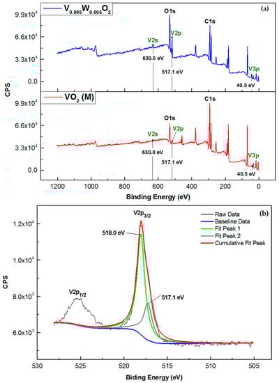 The X-ray photoelectron spectroscopy (XPS) spectra of both pure and doped VO2 is depicted in Figure 4. The peaks representing vanadium, oxygen atoms can be noted. After doping VO2 with 0.5 at % of W, the characteristic peak representing the W4f7/2, which is normally occurs at 32.4 eV, cannot be clearly seen. This was probably due to a small amount of the dopant used. However, it was of noteworthy that an intensity of the V2p peak, representing the monoclinic phase VO2 increased after adding 0.5 at % W to the system. A consideration of the high resolution XPS spectra (Figure 4b) shows that the V2p peak can be separated into two peaks which are V2p1/2 and V2p3/2. Furthermore, by carrying out a deconvolution of the V2p3/2 peak, using the Shirley function, it was found that addition peak at 517.1 eV, representing valence state V4+ [29] of the doped VO2 (V0.995W0.005O2) can be noted. The binding energy of this peak is considered higher than that of the pure VO2(M) (515.8 eV) [22,30]. This indicates that there are 2 valence states of the vanadium after doping. This can be considered as an indirect evidence supporting the incorporation of tungsten into the VO2(M).