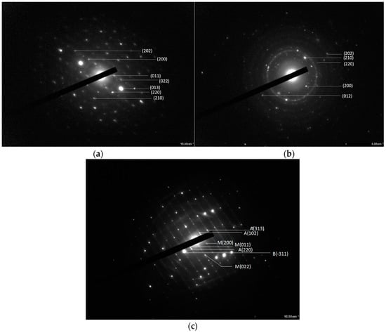 SAED patterns of VO2 (a); V0.995W0.005O2 (b); and V0.98W0.02O2 (c).
