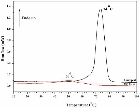 Figure 8 shows DSC thermograms of VO2(M) both before and after doping. An exothermic peak at 74 °C can be seen from the thermogram of the un-doped VO2. This refers to phase transition temperature of the thermo-chromic material, changing from semiconductor (M) to metallic (R) structures. The exothermic peak, representing thermo-chromic transition of the metal oxide also was observed after doping it with 0.5 at % of tungsten. Noteworthy, the peak became broader after doping, due to a mal-distribution of factors, which caused the change in transition temperature [12,18]. Nevertheless, in this case, the peaks shifted downward from 74 °C to 50 °C. This indicates the tungsten dopant was capable of effectively lowering the transition temperature of the metal oxide. Wang et al. [4] studied doping effects of Mg/W in VO2 film and found the similar effect. For the VO2 doped with 2 at % of pure tungsten (without Mg co-dopant), it was found that transition temperature of the neat VO2 thin film decreased from 63.89 °C to a lower temperature (27.05 °C) as compared to our work. The discrepancy could be attributed to the fact that different percentage atomic of tungsten was used.