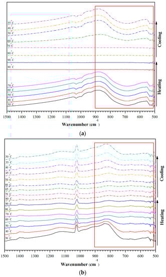 FT-IR spectra of the un-doped VO2(M) (a); and the doped VO2 (V0.995W0.005O2) (b), recorded as a function of temperature.