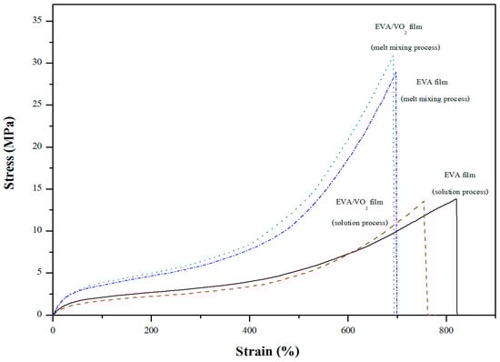 Stress-strain curves of EVA and EVA/VO2 composite films.