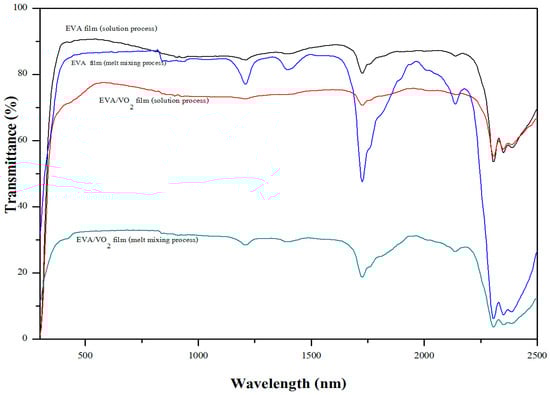 Transmittance spectra of EVA and EVA/VO2 composite films.