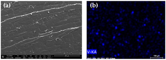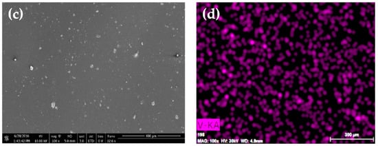 SEM images and X-ray dot map (V-Kα) of the EVA/VO2 prepared via melt blending (a,b); and those of the solution casted EVA/VO2 film (c,d).