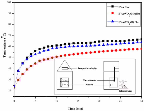 Last but not least, the above results were confirmed by considering the demo system, containing EVA and EVA/VO2 films coated on a window of a model house (see Figure 16; inset). An infrared lamp (PHILIPS, R125 IR R 150 W) was used as a heat source to activate phase change and thermo-chromic behavior of the VO2. The actual temperature in front of the window, measure by thermocouple was 100 ± 1 °C. This is well above the transition temperature of the VO2. Figure 16 shows changes in indoor temperature behind the windows as a function of irradiation time. It can be seen that the temperature linearly increased with time and reached a plateau after about 10 min. The equilibrium temperature behind the window coated with the normal EVA film was approximately 62 °C. The similar profiles were observed when the EVA film was replaced with either EVA/VO2(M) or EVA/VO2(B) composite films. Some discrepancies were noted, however, for these cases. The equilibrium temperature behind the window coated with EVA/VO2(M) was about 53 °C, which is significantly much lower than that of the control system (the use of a window with the normal EVA film). The above effect was not the case when EVA/VO2(B) film was used. Again, the difference can be ascribed to the fact that the VO2(M) is a kind of thermo-chromic material whereas the VO2(B) was not. This reflects that the main factor attributing to the decrease of temperature inside the model house is heat reflectance of the thermo-chromic VO2(M) particles, and not due to light scattering effect.