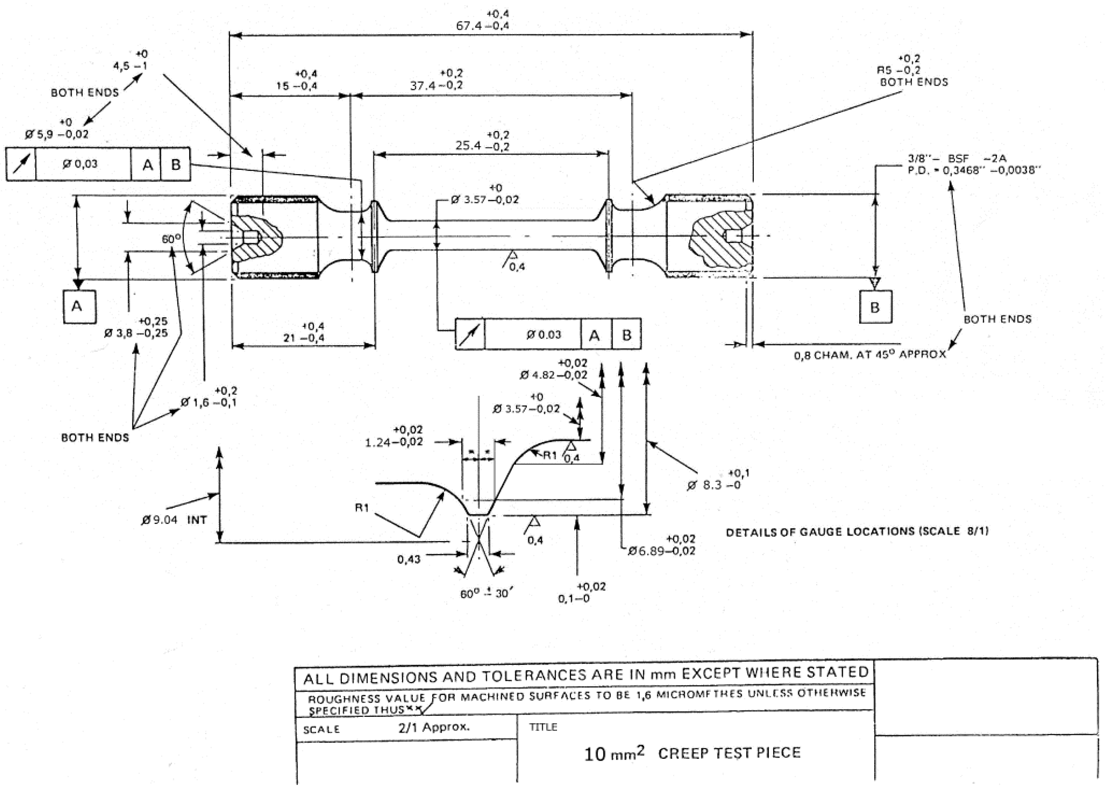Creep testing during the programme was completed in air on a Mayes constant stress creep machine with a loading lever ratio of 15:1 for stresses above 10 MPa (discounting the onset of tertiary failure and necking). Specimen strains were monitored using extensometers incorporating a pair of differential capacitance transducers capable of resolving changes in gauge length to 10 nm.