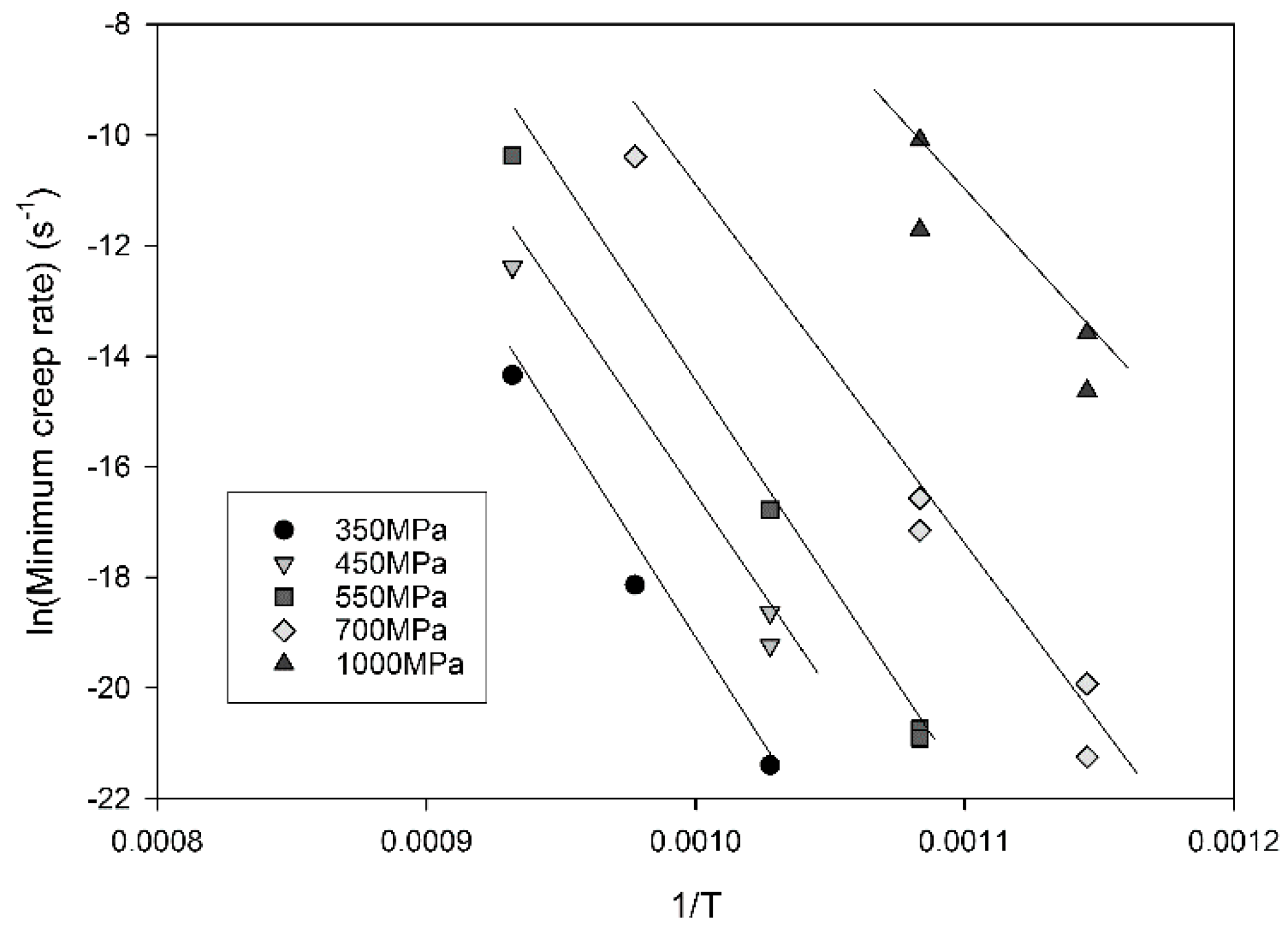 Table 2, values for 650 °C are not included due to a strain monitoring issue during the test.) Furthermore, since the value of the apparent activation energy, Q