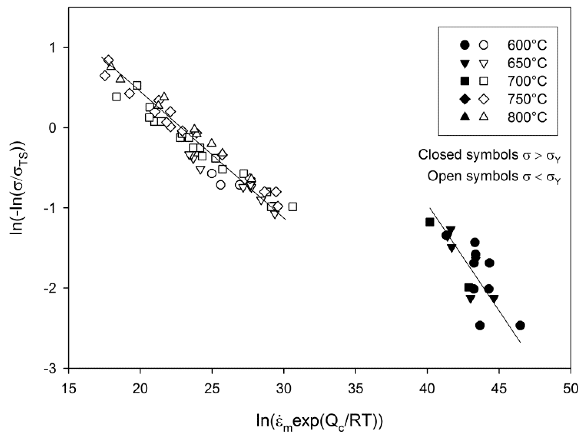 Figure 6. It can be seen that the data produced over a range of temperatures now can be collapsed to a single curve defining a single modified activation energy. Whilst it is recognized that normalization by other temperature dependent parameters (i.e., yield stress) may also be utilized, normalization by the UTS offers a parameter which is easily measurable and encompasses all possible values of stress conveniently between 0 and 1.