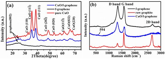 (a) XRD patterns of the f-graphene, pure CuO, and the CuO/f-graphene composite; and (b) Raman spectra of raw graphite, the f-graphene, and the CuO/f-graphene composite.