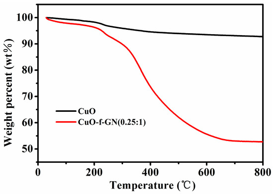 Figure 3 shows the thermogravimetric analyzer (TGA) results of pure CuO powders and the CuO/f-graphene composite. For the CuO/f-graphene composite, the first step of weight loss (4%) from 30 °C to 200 °C indicates the loss of water in the composite while the second phase of weight loss from 200 °C to 300 °C could be ascribed to the degradation of functional groups of f-graphene. Finally, the graphene were completely decomposed from 300 °C to 800 °C, indicating that the content of CuO is 53 wt % in the CuO/f-graphene composite and the weight ratio of CuO to f-graphene is about 53:47. This result is well matched with the set proportion of raw materials. Thus, it is obvious that the raw materials of the graphene and Cu(OH)2 have reacted completely.