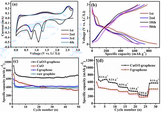 (a) The first four CV curves of the CuO/f-graphene composite at a scan rate of 0.1 mV·s−1 in the potential range of 0–3.0 V (Li+/Li); (b) the first, second, tenth, and fiftieth galvanostatic charge/discharge curves of the CuO/f-graphene composite at a current density 100 mA·g−1; (c) cycling performance of raw graphite, pure CuO, the f-graphene and the CuO/f-graphene composite at a current density of 100 mA·g−1; and (d) the rate performance of the f-graphene and the CuO/f-graphene composite at various current densities ranging from 0.1 to 2.0 A·g−1.