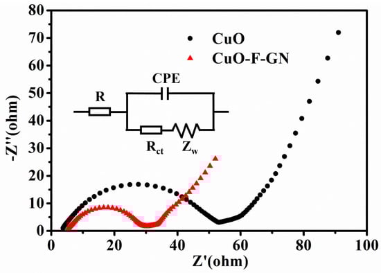 Nyquist plots of pure CuO and the CuO/f-graphene composite electrodes.